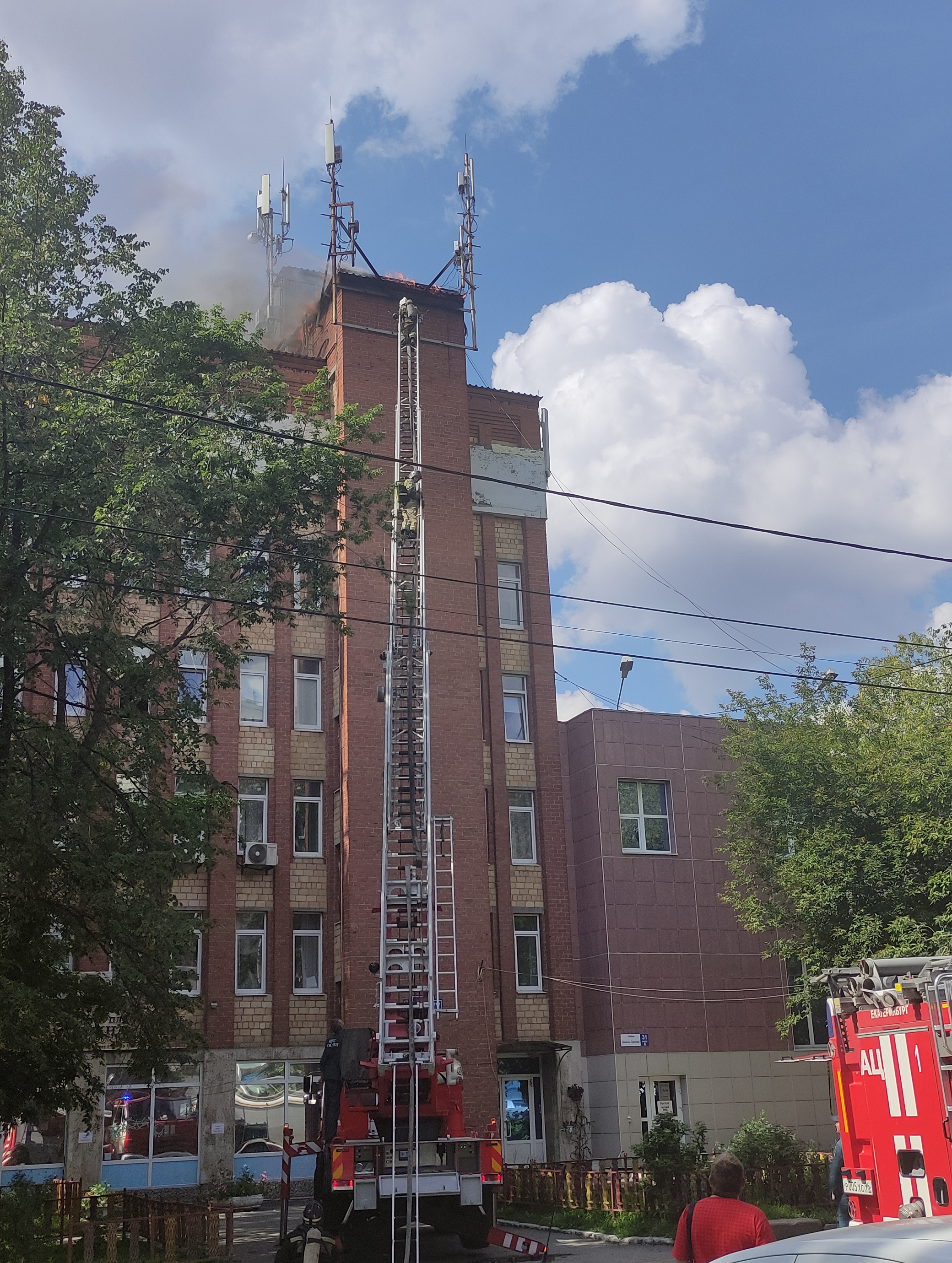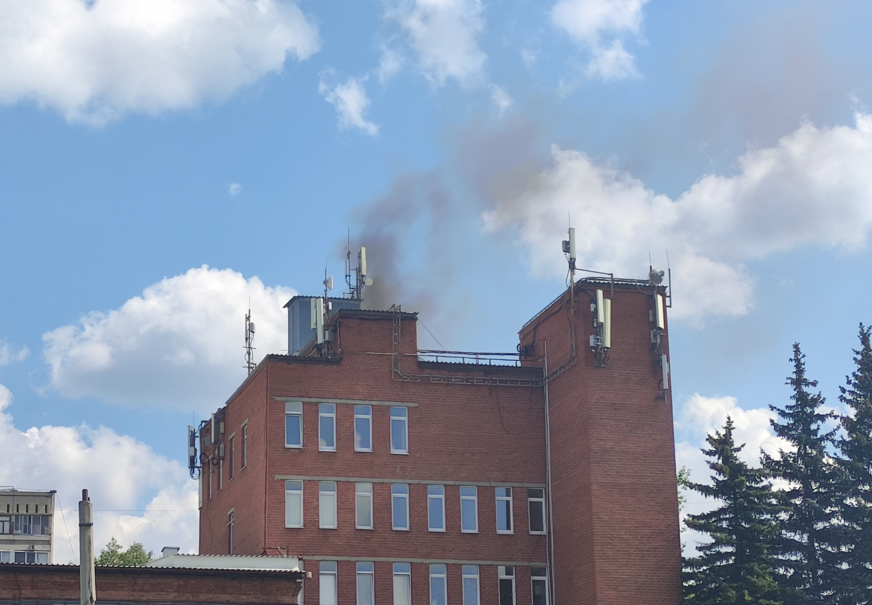 Через несколько минут нам сообщили, что на крыше соседней секции начался пожар. Мы поспешили на парковку во внутреннем дворе, откуда уже можно было увидеть клубы дыма, поднимающиеся над крышей.